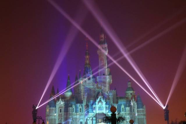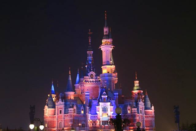 夜晚城堡前有的灯光烟火表演,以城堡为幕布投射出迪士尼经典剧目,配合音乐、灯光、烟火将一天的欢乐气氛推向最高潮。