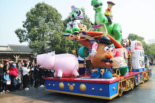 第二辆花车是【玩具总动员】,巴斯光年、牛仔胡迪、蛋头和小猪全员到齐。