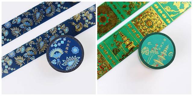【敦煌胶带】不同于故宫胶带的宫廷范,东方密语取材于敦煌壁画的佛陀、飞天、莲花藻井,更古色古香,多些意蕴之美。买了数款,喜欢妙戏游和霁清风(右图),烫金奢华到极致,2018出了很多异形款。