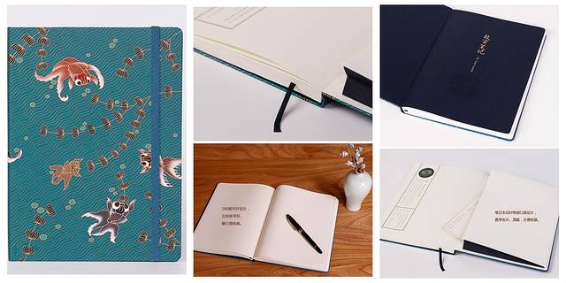 【商务笔记本】目前有四款,126元,金玉满堂(仿珐琅工艺)、水仙迎春(仿剔红)、山水清音(仿彩漆)、灿若星辰(仿钧瓷),之前还有仿点翠的。这个系列本子纸质很好,可以平开书写,底部还有票据袋。