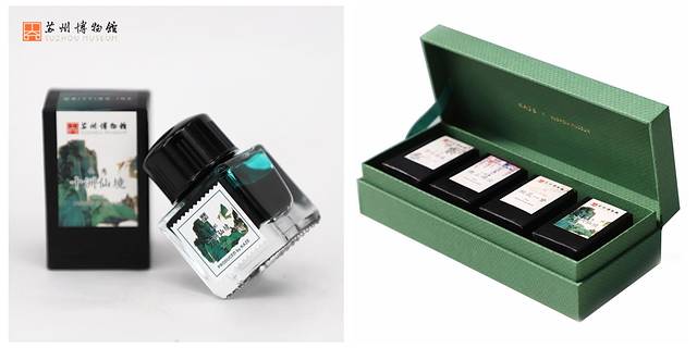 【钢笔彩墨】感觉是苏博人气最高的产品了,颜色名称都很诗意,比如十洲仙境(青绿色)、桃花一梦(桃红色)、衡山烟云(深紫色),喜欢写手帐的可以备一套。最喜欢青绿色,是根据仇英的青绿山水调出来的颜色。