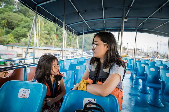 上船后起床气还没消,不让梳头发,像个小疯子一样。Randika告诉我们坐在船长后面的位置,也就是船的中心位置,这个位置相对来说晃的不会那么厉害。七点准时出发,在船上又碰到了我们在Cinnamon吃晚餐时碰到的三个不懂英文的小伙,坐在我们前排,看来我们的行程都是一样的~