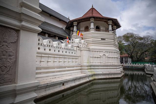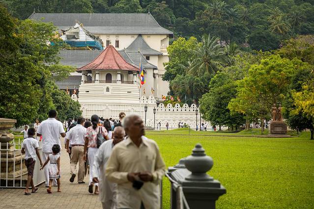 斯里兰卡是南传佛教的中心,而康提是僧伽罗人心中的圣地,因为这里供奉着佛陀的佛牙舍利。我们此行最重要的一个目的地就是康提佛牙寺。据记载,佛陀的涅盘地在古印度拘尸那伽城,火葬后阿难等弟子从灰烬中得到四颗佛牙舍利,其一为帝释天请去,另一为海龙宫请去,余下二颗留在人间。其中一颗在北京八大处,另外一颗在斯里兰卡康提佛牙寺;幸运的是,去兰卡前的周二我在八大处参拜了其中一颗,周日又到了康提,参拜仅存世间的另外一颗,无比的殊胜。南无本师释迦牟尼佛祈祷祈祷祈祷