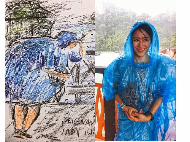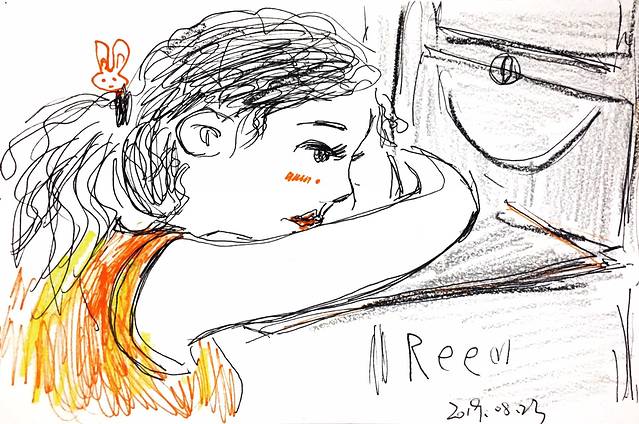 在兰卡威的飞机上邻座的三个娃一直看着来福吃汉堡,看的最痴迷的就是这个姑娘,看着很是可爱,看我在画她赶紧趴在小桌板上。快速画完让她签了个名。
