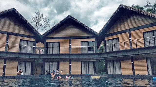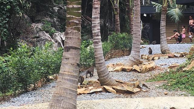 第二天早上起来,一切顾虑都没有了,再也不想着换到二楼的房间了。住宿围着中间的泳池,餐区在泳池对面,泳池旁的音响放着音乐,天气大好,有野生猴子来找吃的,一万个放心了。