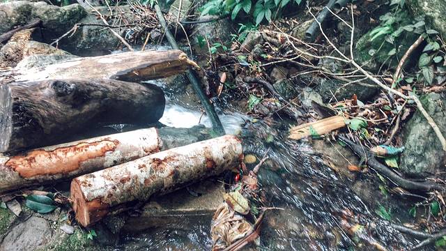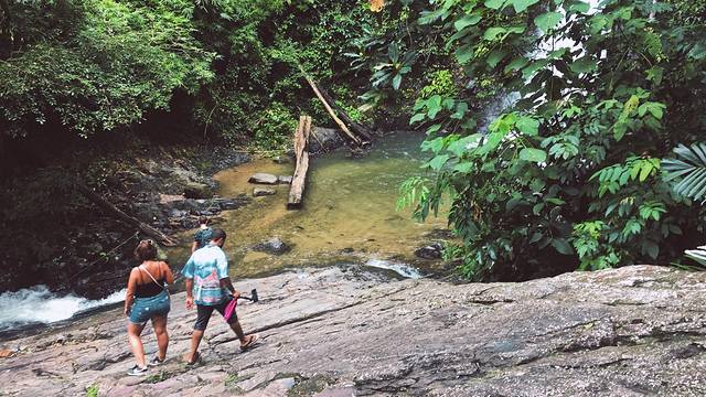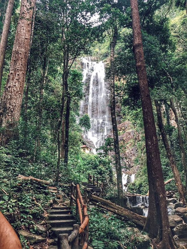 水很清凉很舒服,顺着阶梯往上走就是小瀑布,路面湿滑要小心,不要玩手机,山上猴子也会出没抢食物。在这里一哥们因为录视频,脚滑滑进瀑布里,石头常年浸泡在水里长满了苔藓,连续两个去搭手的人全滑进去了。我只好脱下鞋子坐在石头上小心的去抢救他们的电子产品。最后哥们丢了手机,姑娘丢了一只鞋。
