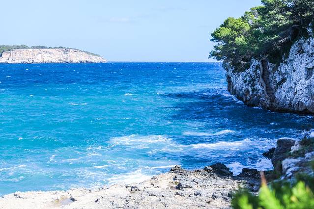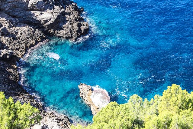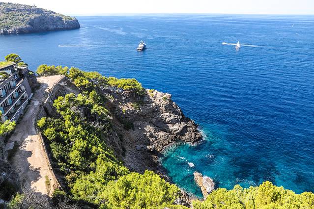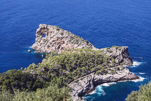 在这里能欣赏到马略卡最著名的地理风景之一Na Foradada海角。这是一个很小的半岛,在其尾部的巨石上,经过年复一年的风水侵蚀,中间形成了一个直径18米的圆洞。这个景点每天都会吸引很多一日游的帆船来此出海,还会有老外一路徒步到底下的山头。