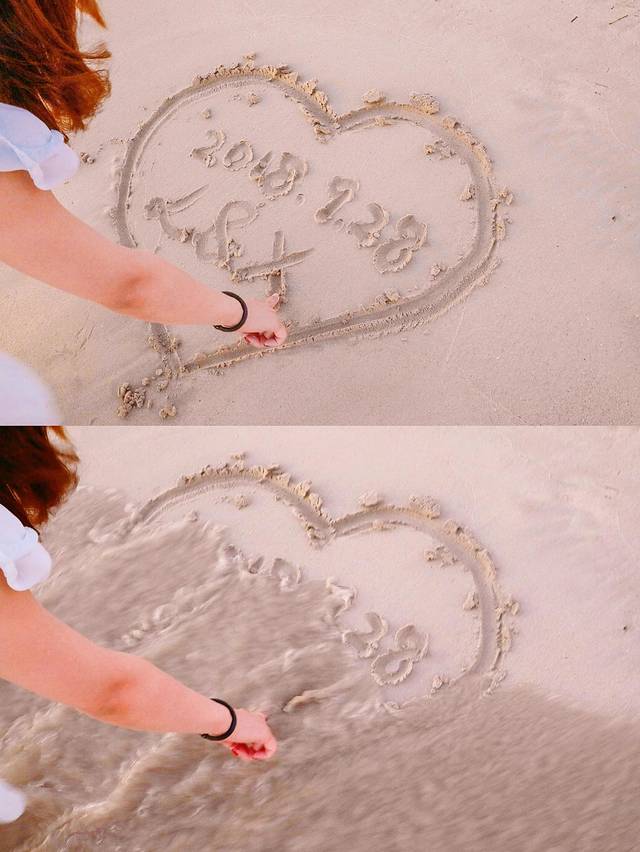 在沙滩上刻下我们的印记,指尖划过最后一笔的瞬间,浪就打上来把它冲没了,就那么一秒钟的时间,竟被老公抢到了。