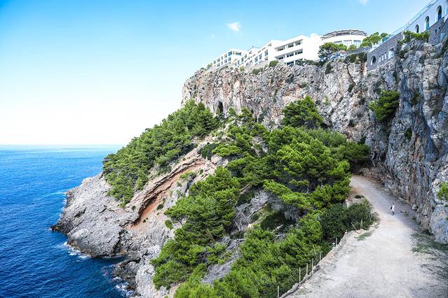 顺着岩石路拾级而上,绝美的地中海美景蔓延至天际,海水深邃而蔚蓝,一座山崖直插蔚蓝的海平面。