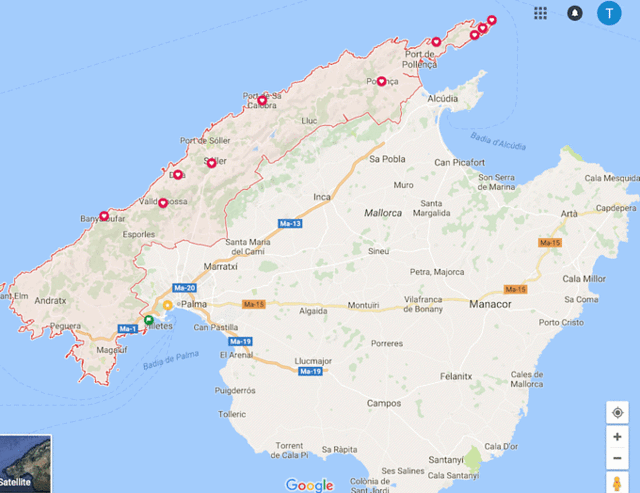 下图中标的一个个小红点是岛西北部的精华景点,除了Banyalbufar和Sa Calobra我们都去到了。当然,如果是自己搭乘公交前往,一天内想要走完是完全不现实的。