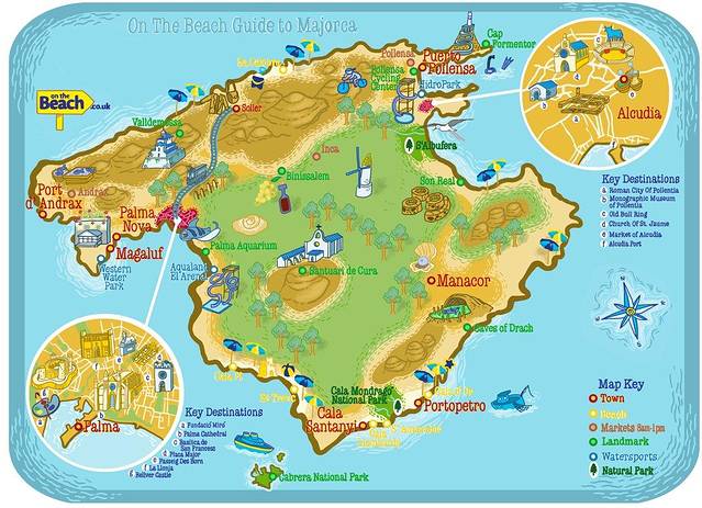 先附上一张马略卡游玩景点地图,岛上大部分景点都有标注,而且画得生动形象,一目了然,看一眼就很容易记住。按区域,我把岛上景点划分为以下几条线路,大家可以按此思路来策划行程。