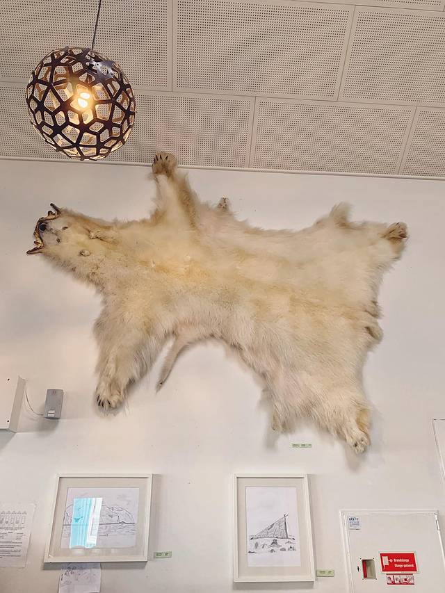 餐厅墙上挂着的一张北极熊皮,是真的北极熊皮,