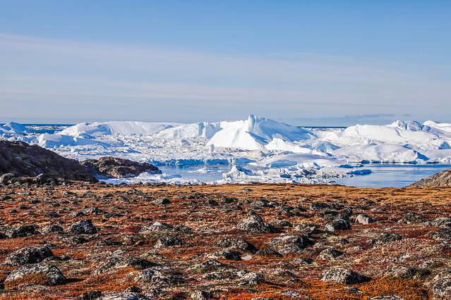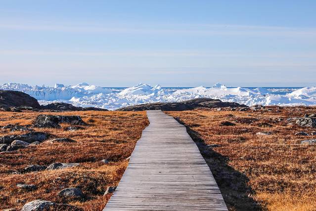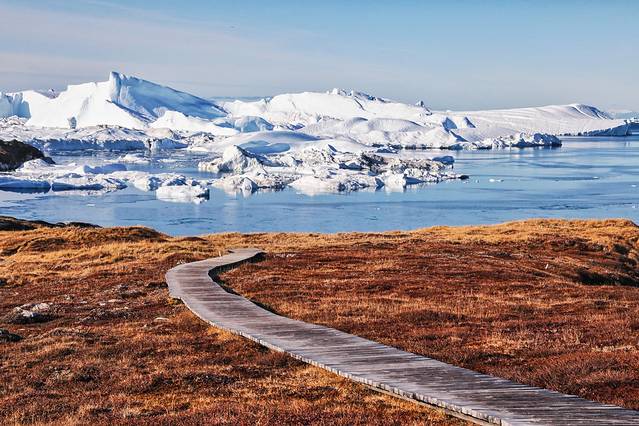 💙蓝线:蓝线最长全程6.9公里,从一条平坦的木栈道逐步迈入格陵兰世遗伊卢利萨特冰峡湾,到达Sermermiut拐弯上山后景色开始极为震撼,整片峡湾完全被冰山覆盖,山顶上有个长椅是最佳观景位。从这之后继续围绕这片冰峡湾徒步,景色与之前略有雷同,体力不足者可选择在长椅处这回,我们一直徒步到蓝红两线的交汇点Holms Bakke,从红线返回。