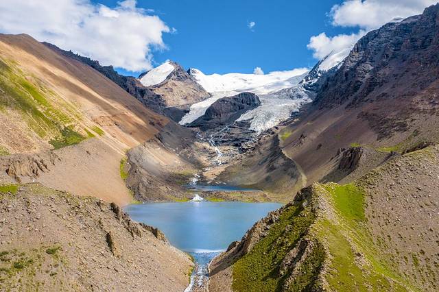 继续往江孜县方向,在到达卡若拉冰川之前,有一个野生景点,路旁的牌子标着恰羊措,但是地图显示强宁措,还是放不清楚那个是真名。我查阅了很多资料下也没找到,网络上关于它的介绍寥寥无几。至今我还不知道这是不是它的真实名字。可能是冰川融化的雪水形成了新的堰塞湖。