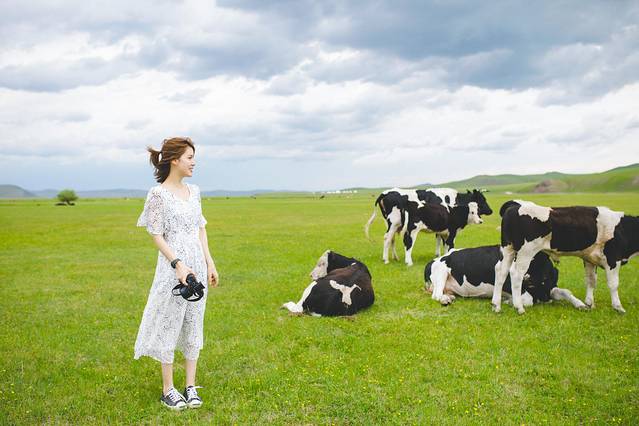 第三种神兽“牛”,大家天天喝牛奶,广告词里面也都是说来自某某某草原上的奶牛,来到大草原就可以见识到真正奶牛了,美琪一看就是城里的孩子,看到奶牛很好奇,对着它们傻笑。