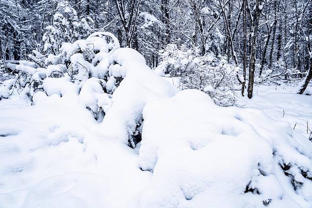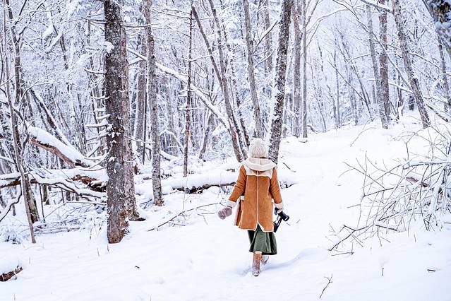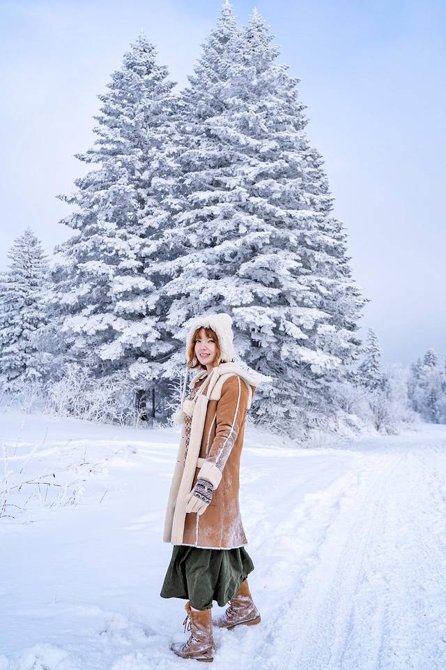 和我们一起租车的一对小情侣,也跟着我们一起来到雪岭。我们沿着小路,直接走进了雪岭的森林,这样才能更加好的体验这里的美景,积雪被我们走出一条雪路,路面还是比较滑,但是四周的美景让我们毅然勇往直前。