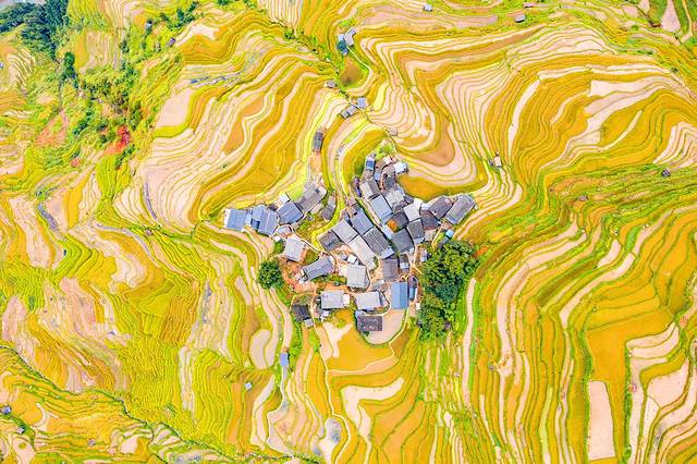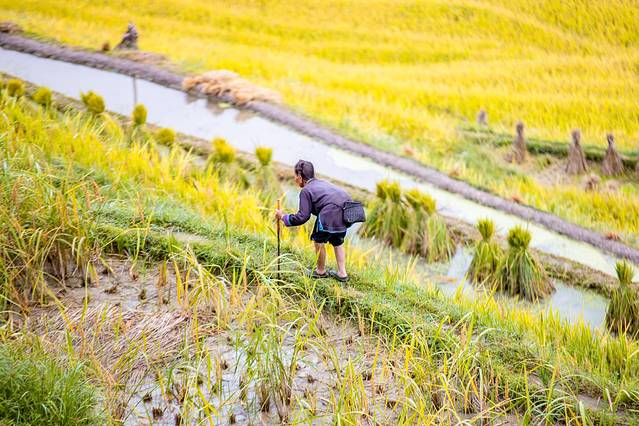 加榜梯田位于苗族侗族自治州从江县西部月亮山腹地的加榜乡东北面,距县城80公里,我们从肇兴侗寨过去需要先经过从江县城。加榜梯田也是中国最美的梯田之一,梯田里散落着苗乡特有的吊脚楼。我们正好遇到水稻成熟的时刻,梯田一片金色,应该是除了注水期之外,梯田的另外一种美。