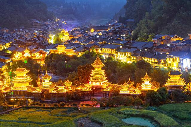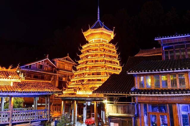 肇兴侗寨仁、义、礼、智、信5座鼓楼风格各异,层数不同,最高者13层,彩绘各类风物故事、飞禽走兽。最早的一座鼓楼为清光绪年间建。鼓楼上置放鼓,旧时遇有重大事情,由寨老击鼓召集本寨人共议。鼓楼不但是集会议事、订立款约、处理大事之地,又是重大节日迎送宾客的场所。在不到200米的 肇兴 河上,横跨5座花桥,与鼓楼相互辉映。来到这里一定要分别去打卡这几座鼓楼,特别是夜景金碧辉煌特别具有观赏性。