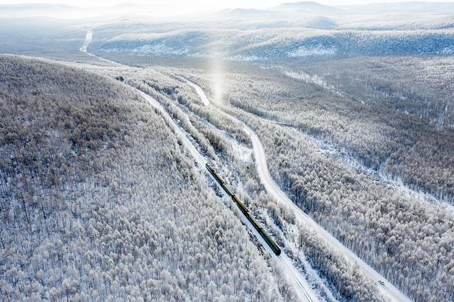 这条铁路在大兴安岭中穿过,正好遇到铁路管理的工作人员在公路上值班,告诉我们马上有一趟列车经过,要我们注意安全,我们就停下来一起等待这趟列车,航拍下的列车,在白茫茫一片的森林里穿越,让我想起了电影《雪国列车》中的场景。