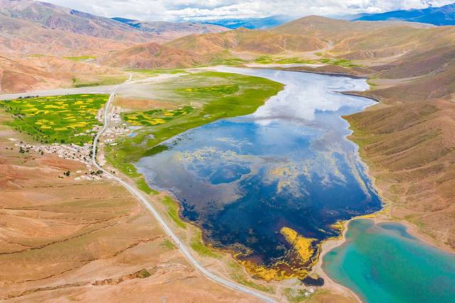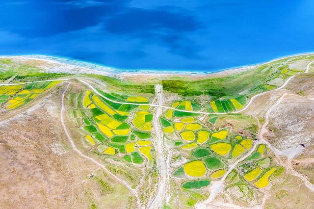 前往日喀则好像大家都会来到山南浪子卡县的羊卓雍错,六月羊卓雍错湖边就盛开着一片片金灿灿的油菜花,每个村庄周边都种满了油菜花。半山腰上俯瞰,金色、绿色和蓝色相互交映,梦幻一般。沿着环湖公路往浪卡子县方向行驶,曲折的珊瑚状的湖边走走停停,羊湖美在于湖水的色彩,碧蓝的湖水总能给你带来视觉的冲击。她的蓝色会随着天气和光线的照射而变化,深蓝、浅蓝、孔雀蓝,蓝的变幻莫测。