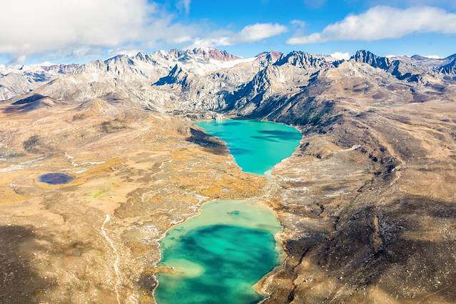 沿着318向西,翻过沙鲁里山脉中段的一个垭口、拐个弯就看到海子山姊妹湖。两处碧绿澄净的湖泊,紧密的相依在一起。在荒凉的山野上,如同镶嵌在大地上的宝石。
