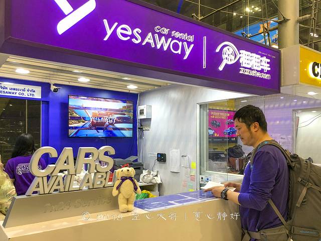 抵达曼谷已经晚点,再加上办理落地签证排队,等入境手续完成,我们的两只行李箱孤零零地已经从行李转盘上被安置到一边。拖着行李箱走出国际到达,不需要出航站楼,在国际到达大厅的2楼,也就是抵达的同层,向左转找7号门和8号门之间,那里是租车行柜台的聚集地,紫色的Yesaway公司和租租车的招牌非常醒目,一眼就可以看到!