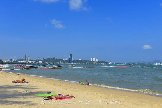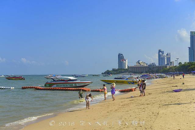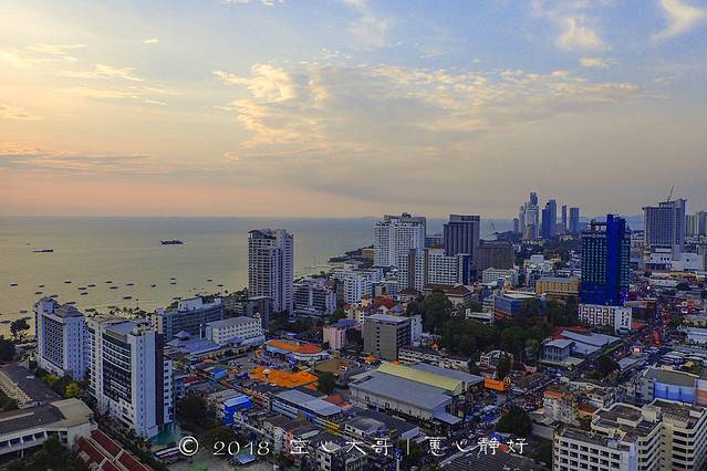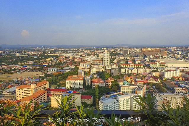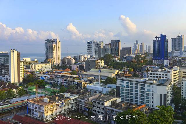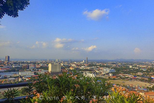 远处海岸小山坡上,有鲜红色的Pattaya City字样。