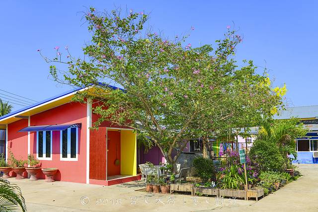 度假村一共10来套度假屋,每个都是色彩艳丽,门前花团锦簇。