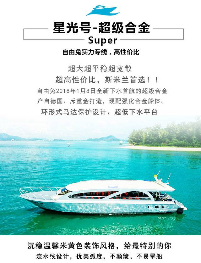 这次斯米兰之行,选择的是在斯米兰有多艘自己的船运营,成熟负责的中文导游的泰国旅行供应商——自由兔,超级合金快艇星光号的行程。它家的特色是:自家资源+全岛接送+独家邮轮海景午餐+专职中文导游+私人码头+三餐服务。