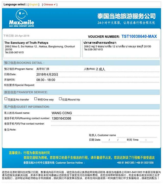 在泰国,这样的上网卡普遍标价是299B,折合人民币60元,而在国内提前网购,价格只要不到30元,还包邮!由于一般去泰国旅行,还会在网上像我一样预订其他游程,都需要填写在泰国的联系方式,所以提前购买泰国电话卡非常重要!拿到电话卡,封面上就有你的电话号码,接下来预订其他行程都可以填写上你在泰国的联系方式了!
