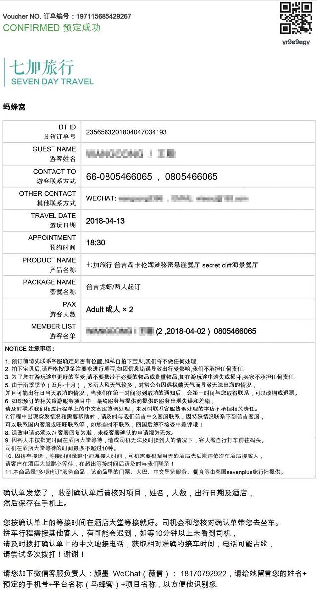 选择的供应商是大名鼎鼎的“七加旅行”,整个采购过程就是一种美好的体验。客服彬彬有礼,介绍餐厅和各类套餐耐心细致。下单到订单确认迅速相应,悬崖餐厅的套餐也非常丰富,从最具有性价比的“安达曼”,到以新鲜鱿鱼为主菜的“泰美味”,当地龙虾+海鲜BBQ为主打的“普吉龙虾”,“新鲜对虾”套餐、泰海鲜以及“BBQ海鲜”套餐,琳琅满目,令人目不暇给。最后我们选择的是“普吉龙虾”套餐,双人人民币370元。