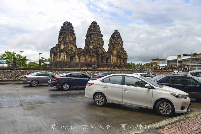 开车绕行寺庙一周,来到正门,高棉佛塔在晴空下甚为壮观。