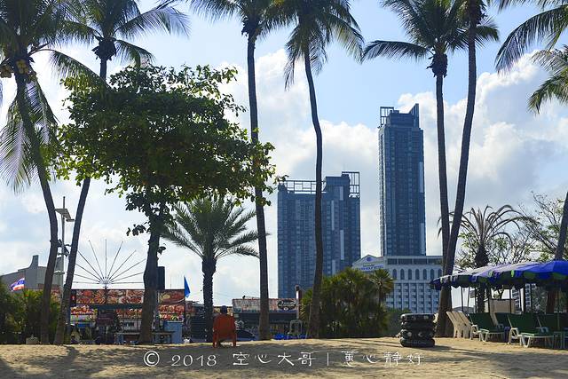 芭提雅海滩如一轮新月南北蜿蜒,那么哪里才是她的最中心呢?我想应该是那个周边最大的停车场吧,几乎所有来海滩的旅行社大巴和自驾车辆都会停驻在这里。它的东面隔街的高层,就是我在芭提雅入住的Airbnb民宿。