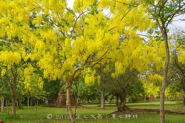 我们导航的目标直接是“象庙”,想找的住宿离景点越近越好。结果在快抵达目的地几百米的地方看到了这家度假村:Chatpailyn Resort。一把方向直接开进去,问老板娘说有房,太好了。这就是我们入住的度假小屋,门前金链花盛开。