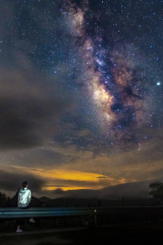 刚开始又开上山时,我们在山脚下已经看见了漫天繁星,想着山上天气已经好转了吧。上山下山好几回,还是等不到雾散,偶然在路上的一个瞬间抬头又看见了银河,想着山上的雾应该是散不了了,于是就在山路中开始了星空拍摄。