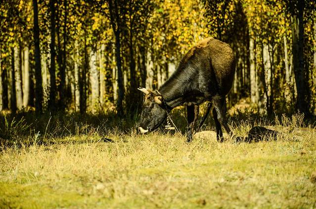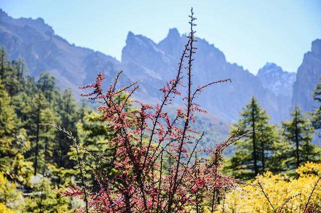 去洛绒牛场的那段6公里左右的路程我们选择了徒步,没有坐电瓶车,也正因为选择了全程徒步,才看到了更美的风景。相比最后的牛奶海五色海,我更喜欢这段走在被秋色包围里的栈道。