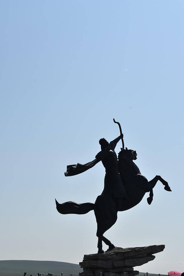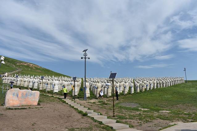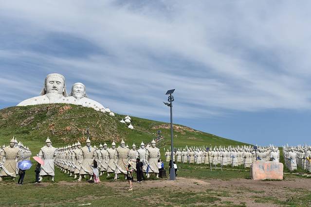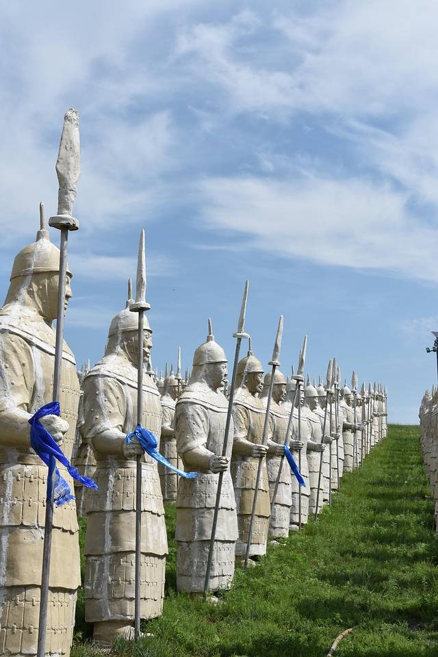 可汗山距离这里不远,在一处山坡上,修建的玻璃钢材质的800名蒙元兵阵和蒙古族开国元勋。这里不要门票,停车免费。800个蒙古兵俑各400名分开布列,这边拿刀,那边持矛,每个有2米多高,威风凛凛。
