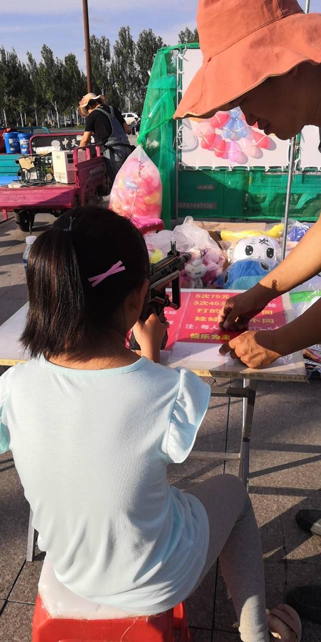 汉庭酒店楼下镜湖广场好多小孩玩的,小芒果要打枪。