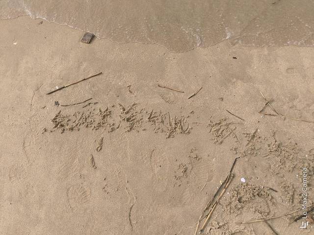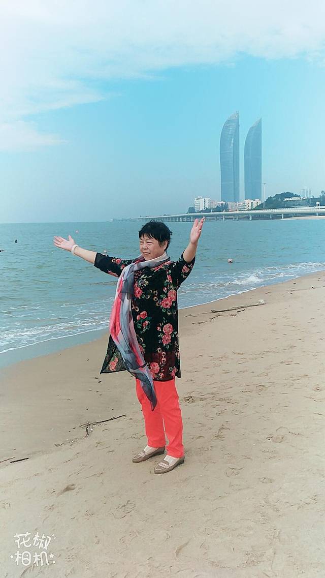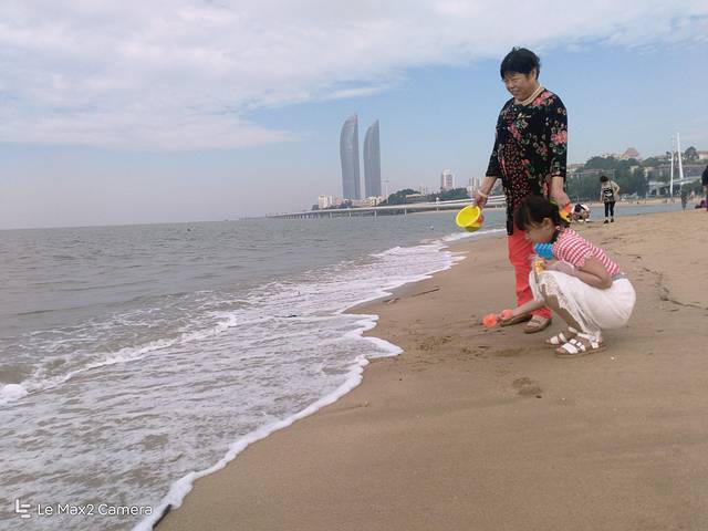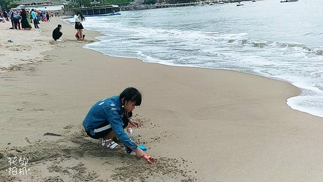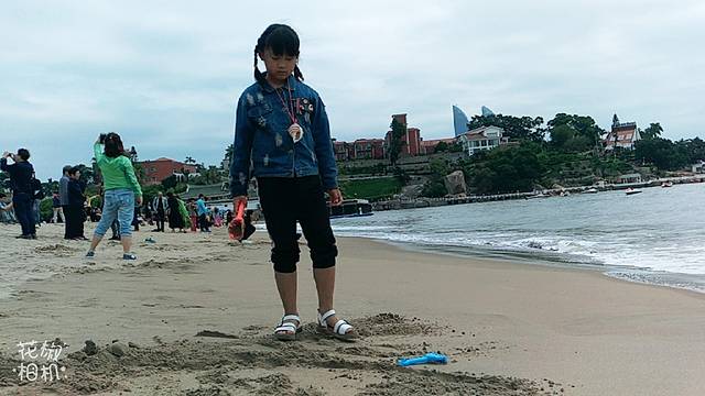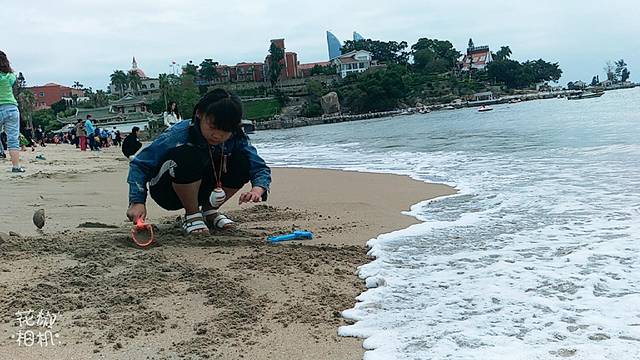 今天阴天,海水不如那天胡里山看到的清澈,赶上涨潮,一会工夫,水就到了脚下,差点淹了我们的包和衣服。