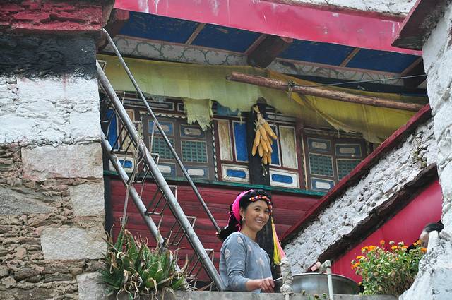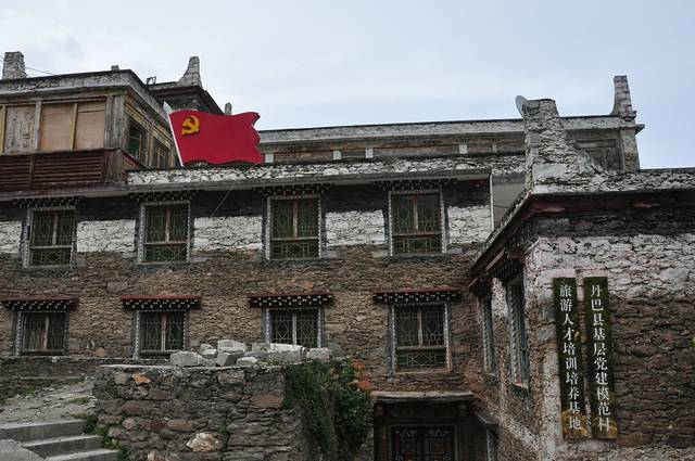 我们踏上藏寨高低不平的老石板路,狭窄曲折,曲径通幽,走几步就是断头路,径至藏寨人家,想入户了解了解民情,可大多关门闭户,我们只好看看民宅外观。藏寨民居的房屋很有特点,屋顶四角都高高矗起一个白色触角,不知有何意义。后来领队说是代表他们藏族不同的族别标志。