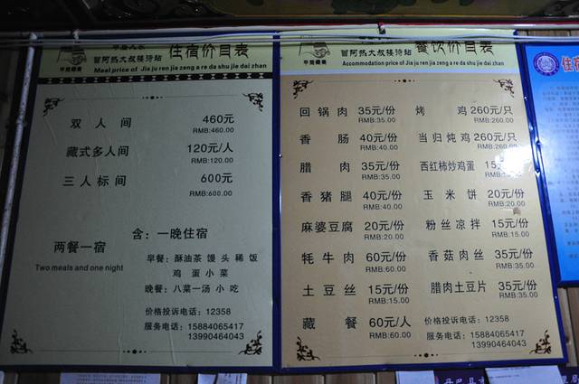 我们盲目的游走,上上下下,转了将近三个小时,好容易顺着公路才回到住宿点,领队安排6点半回酒店吃饭,我们差点耽误。晚饭就在酒店吃,原来住宿是包括晚饭的,当天入住的游客还真不少,足足有6、7桌之多。菜虽然不是很丰富,但是老板备了青稞酒,满足了游客的口福。