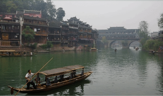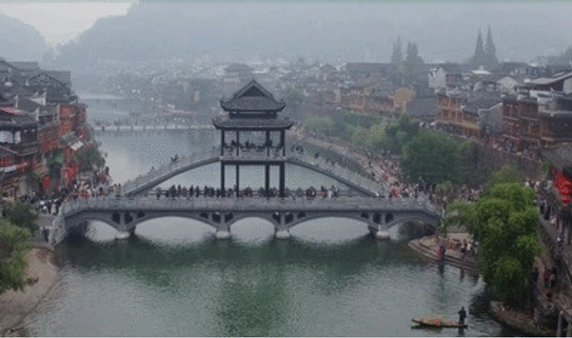 行一百步,虹桥东路右侧有凤凰县第一中学。木栅门显现出它悠久而光辉的历史。又行数百步,见虹桥。与想象中不同的是,此虹桥并非木桥,实乃石桥。石桥为廊桥,粉墙高瓦。桥上众多商铺齐齐开张迎客。桥下,一汪碧绿的沱江水自西向东流去。
