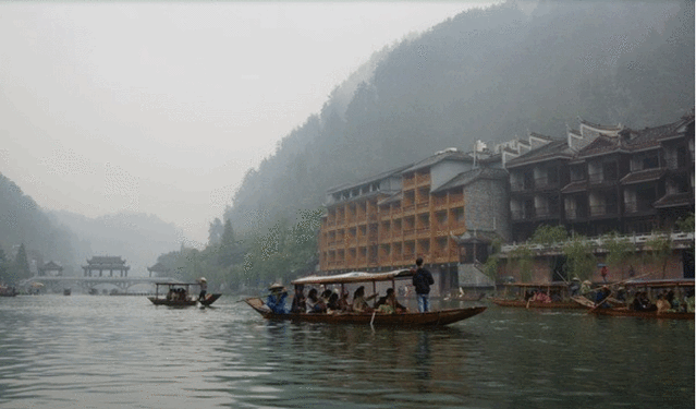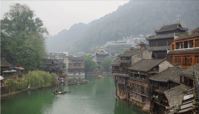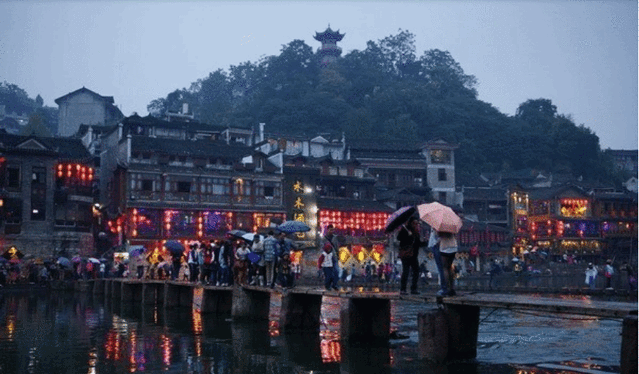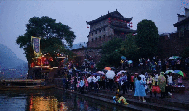 摩托风驰电掣的穿梭于凤凰古城车流中,十分钟不到便来到酒店——不禁佩服自己的英明:在这样的小城里,两个轮子是最快的。沿途有些外地的私家车,泥泞挂满车身,早已趴窝在两旁。司机说,昨晚有人便是睡在车里的。更有甚者,为了一个八百元一晚的高价房争得你死我活。因此,在长假,千万不能开车来凤凰!凤凰阴雨绵绵,除却人流汹涌,确有湘西临水人家的风尚。下榻皇朝大酒店。刚进门吓了一跳:阴沉空荡,与外面的繁华毫不搭界,还以为走进了黑店。待值堂经理走来开了灯才觉得至少有个招待所的模样。从虹桥路出发自北向南,一路皆为食肆旅馆。下午四时,却已开张待业,人满为患。
