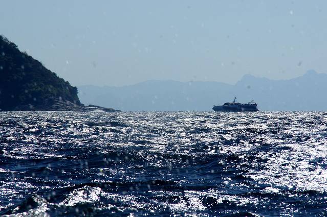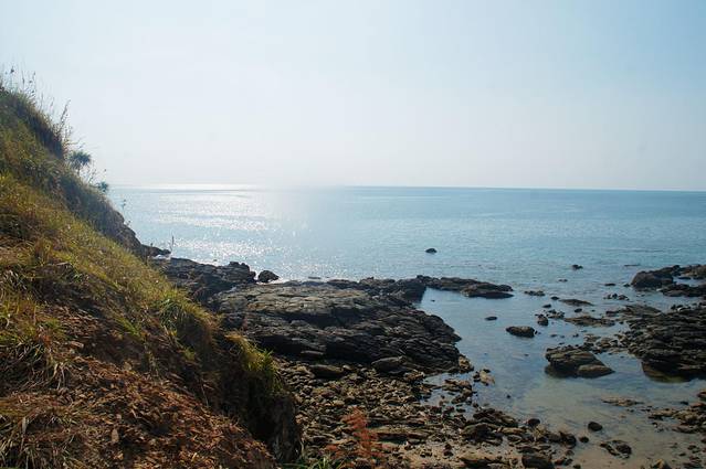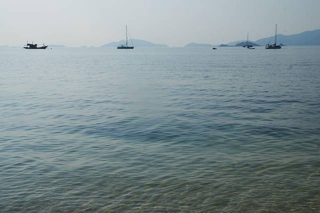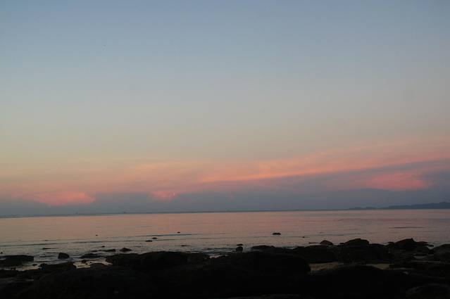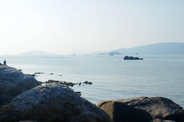 在海对面,山和岛错落有致,一层层的在视野的远处展开,如同一幅水墨画卷。那一抹淡淡的霞光,恰似点睛之笔,在天空中挑出一片色彩,随手的涂抹出写意的层次。