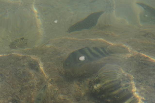 池水清亮,在阳光下呈现着绿色,水池里面也有不少鱼在游来游去,水色不见得胜过九寨,但能够亲水游玩就很好了。