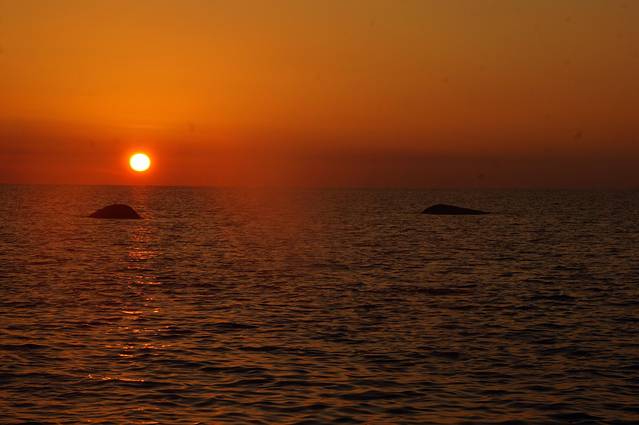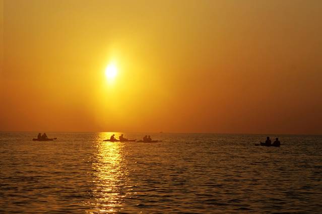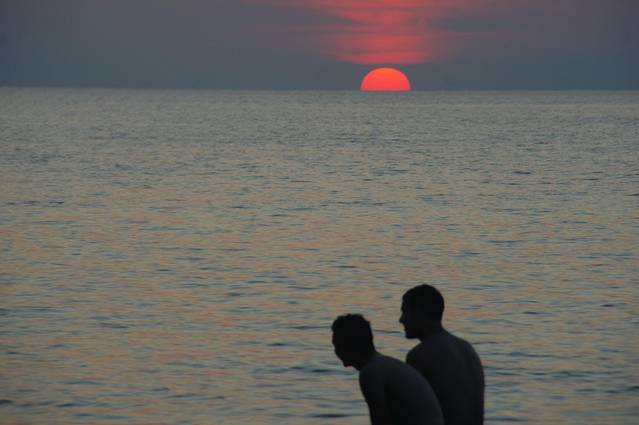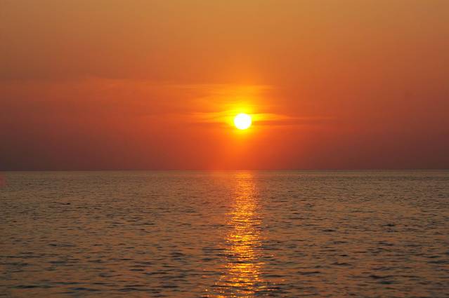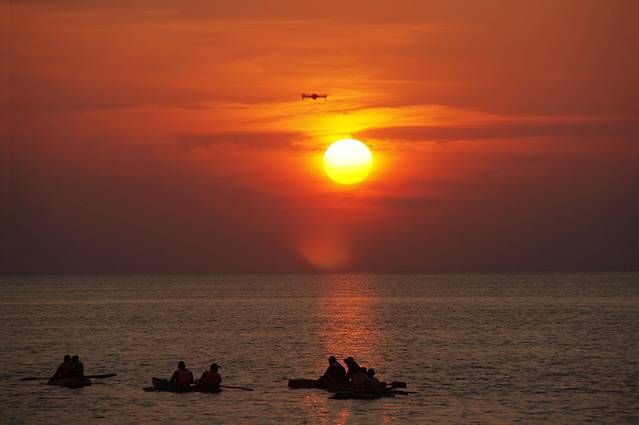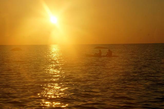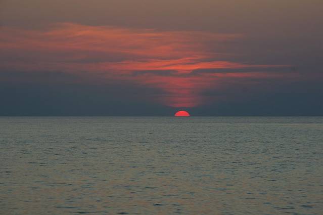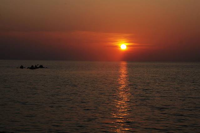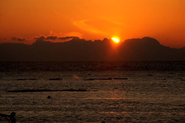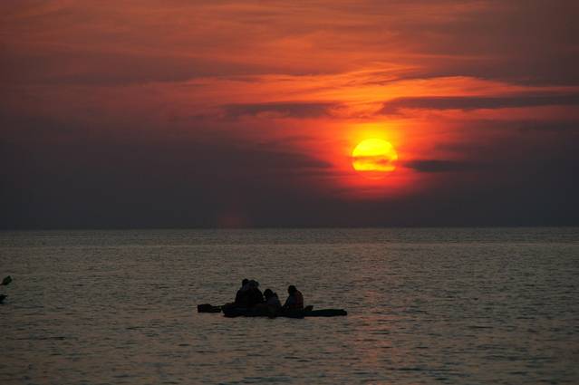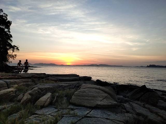 西沉的落日将天空染上了一层朦胧的淡红,人们纷纷从沙滩走到岛上,去欣赏美丽的夕阳。