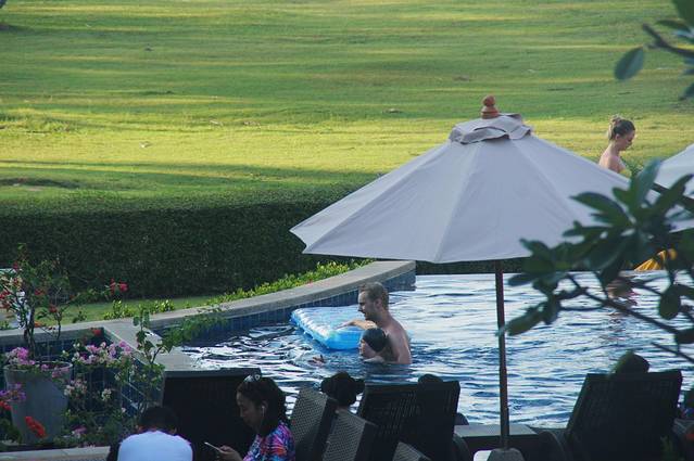 简单放下行李,小宝迫不及待地扑进了泳池。
