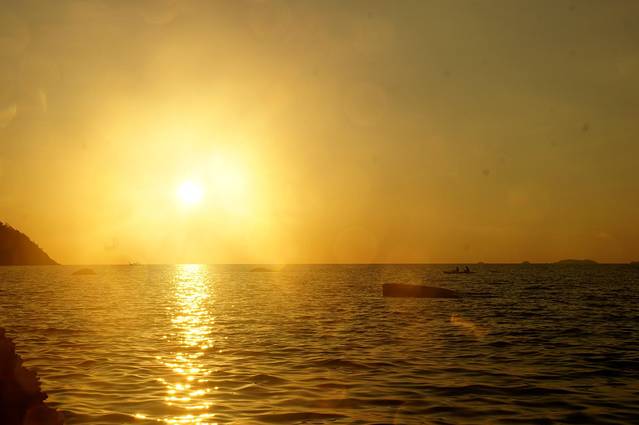 一下午的时间就在酒店和泳池间慢慢消磨过去了,不知不觉已经来到了黄昏。斜下的夕阳把沙滩和海洋都染上了一层淡淡的金色。