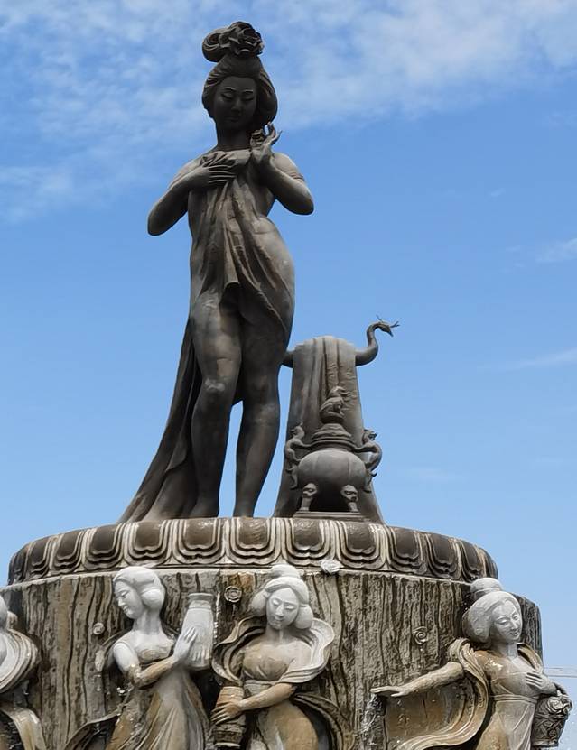 从这尊铜像可以看出杨贵妃真的很胖,雕像的作者也不作一点掩饰,仔细看杨贵妃的大腿,肉是一坨一坨的,已经肥出皱褶来了。