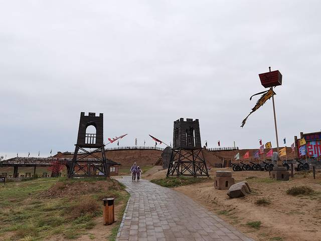 离开原始人部落之后景区有区间车送我们到下一个景点——明长城遗址,这是我们这次旅程第三次游览长城,不过这里的长城由于历史太久远,而且经过战火的洗礼,现在只剩下一小段城墙。原来在这里已经是宁夏省和内蒙古的边界,登上城墙上可以看到,一边写着“内蒙古地界”,一边写着“宁夏地界”。而城墙的另一头,则有两个石柱,分别是“宁夏部落”和“鞑靼部落”。我们站在这里打开手机地图,果然看到我们已经身处内蒙古的鄂尔多斯市。